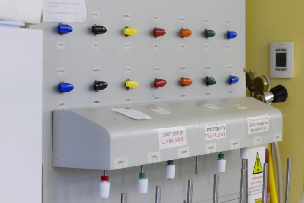 The Perepichka and Skene groups synthesize new compounds and have access to broad range of chemical synthesis and characterization equipment including multiple hoods, furnaces, rotovaps, centrifuges, sublimation setups, flash chromatography and wide range of spectrometers (UV-VIS, fluorescence, NMR/EPR, FTIR, etc.).